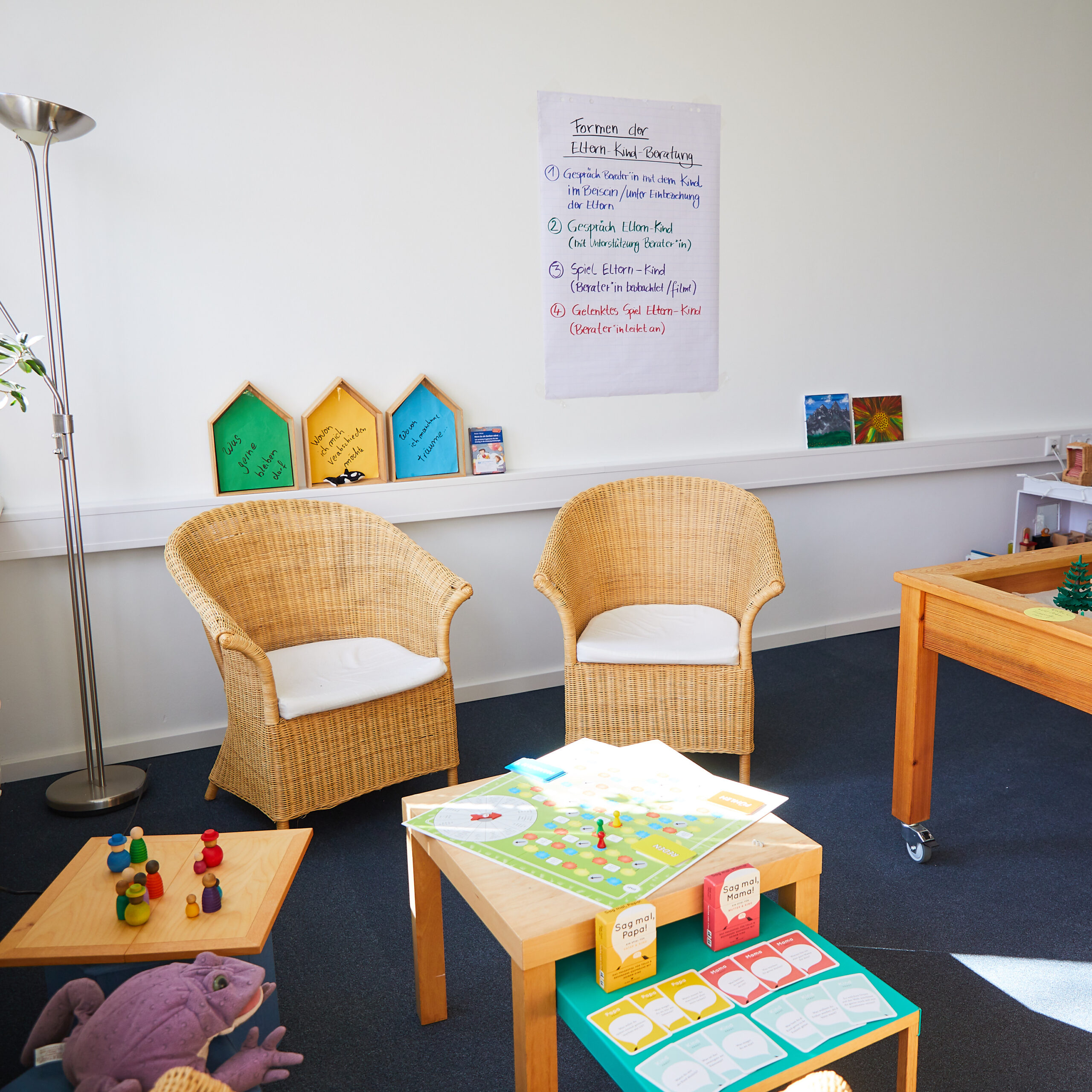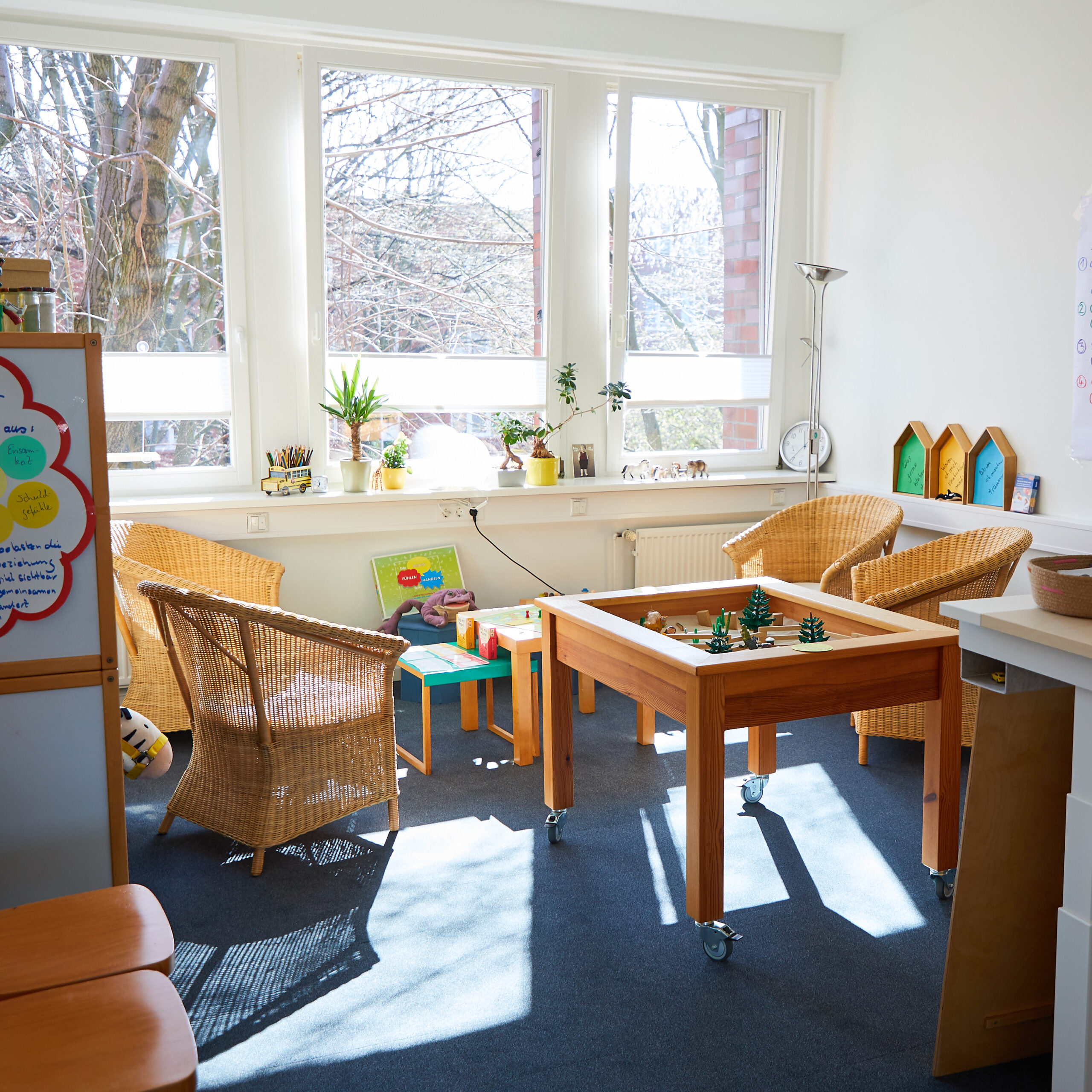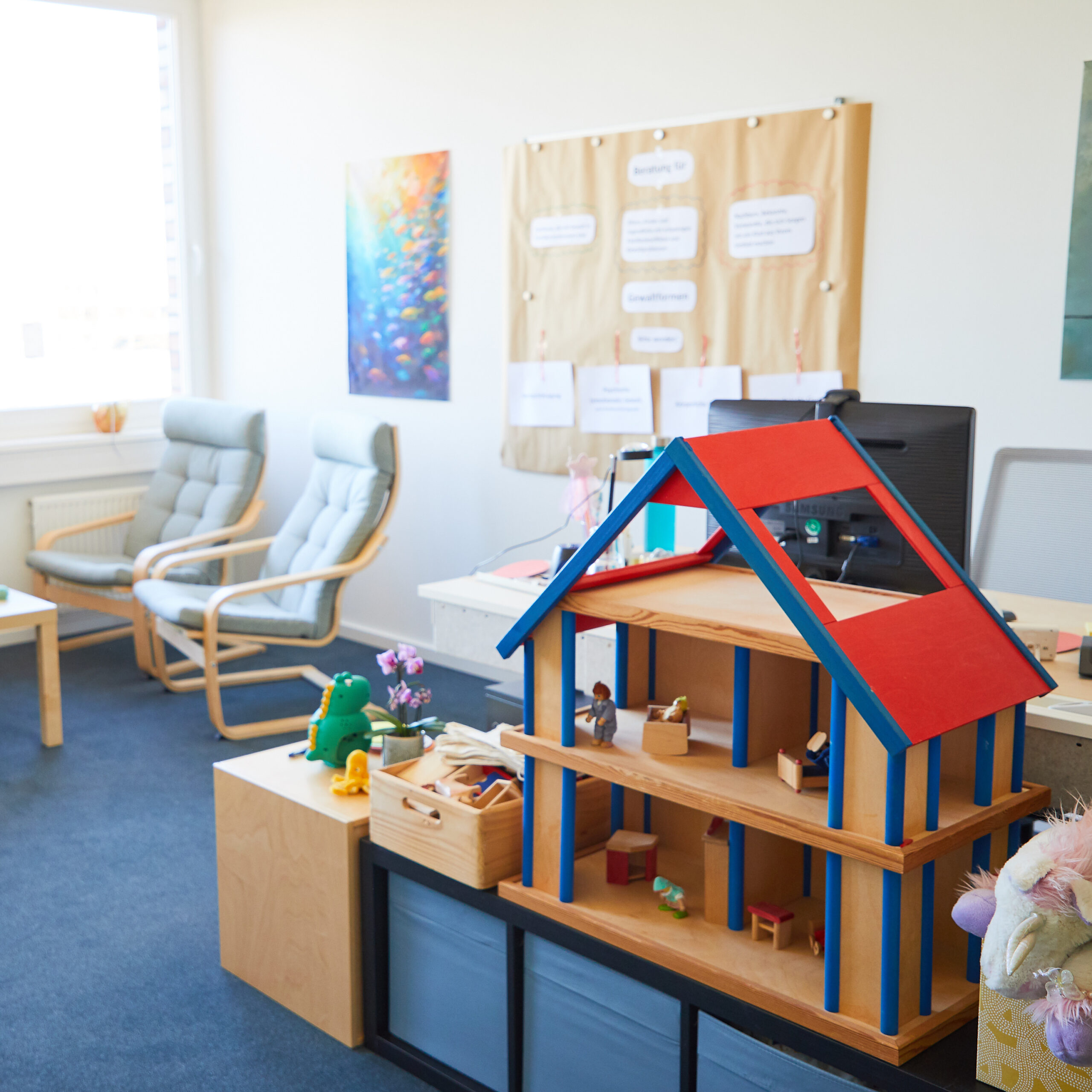 Jeder Raum wurde individuell gestaltet und ist darauf ausgerichtet, eine gute und vertrauensvolle Atmosphäre für eine bedürfnisorientierte Arbeit zu schaffen.