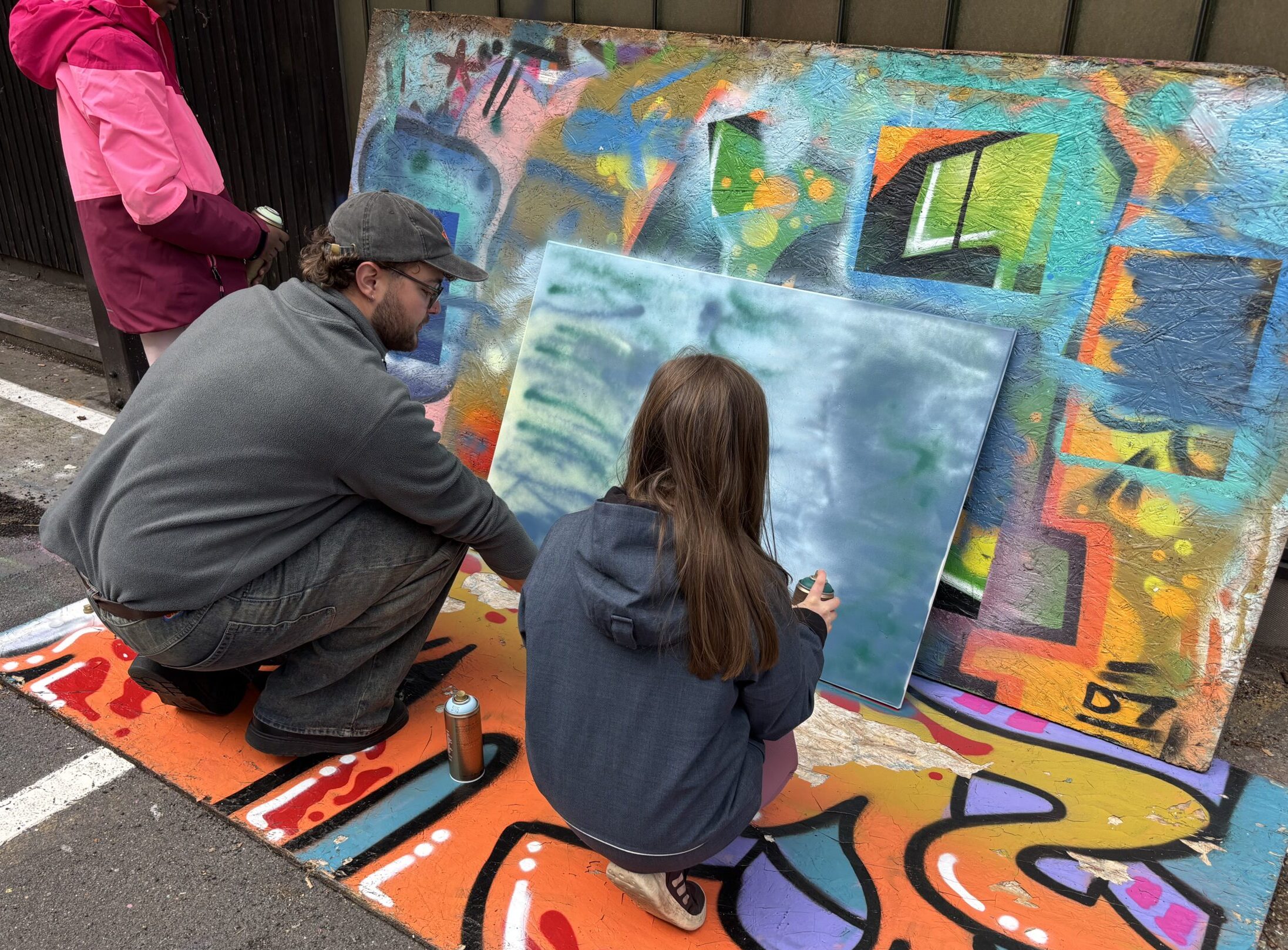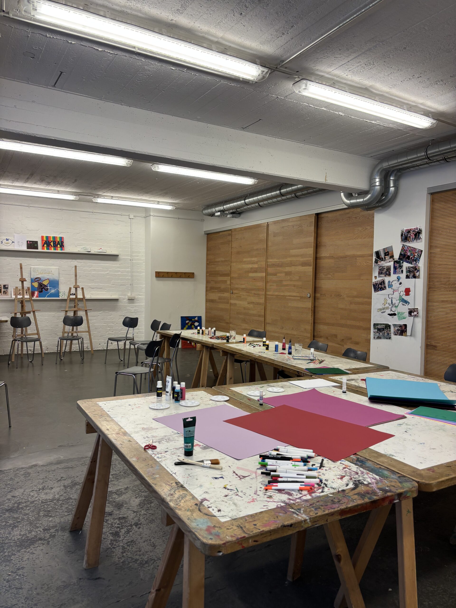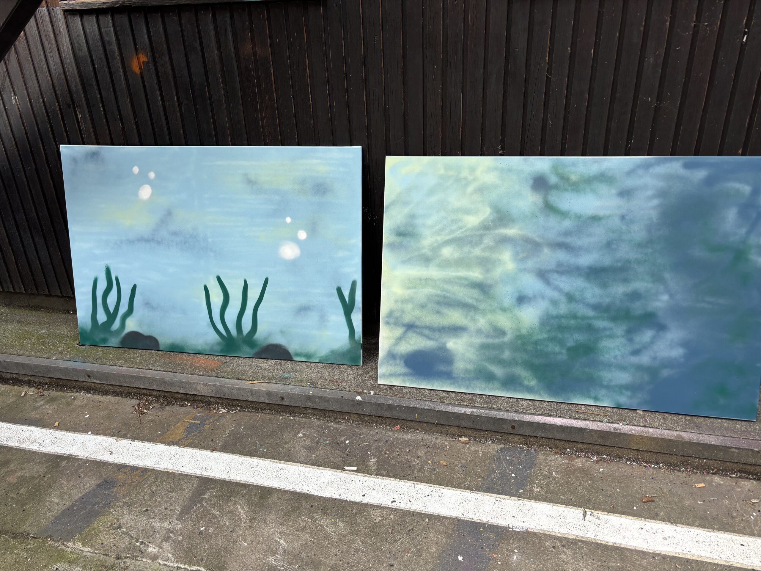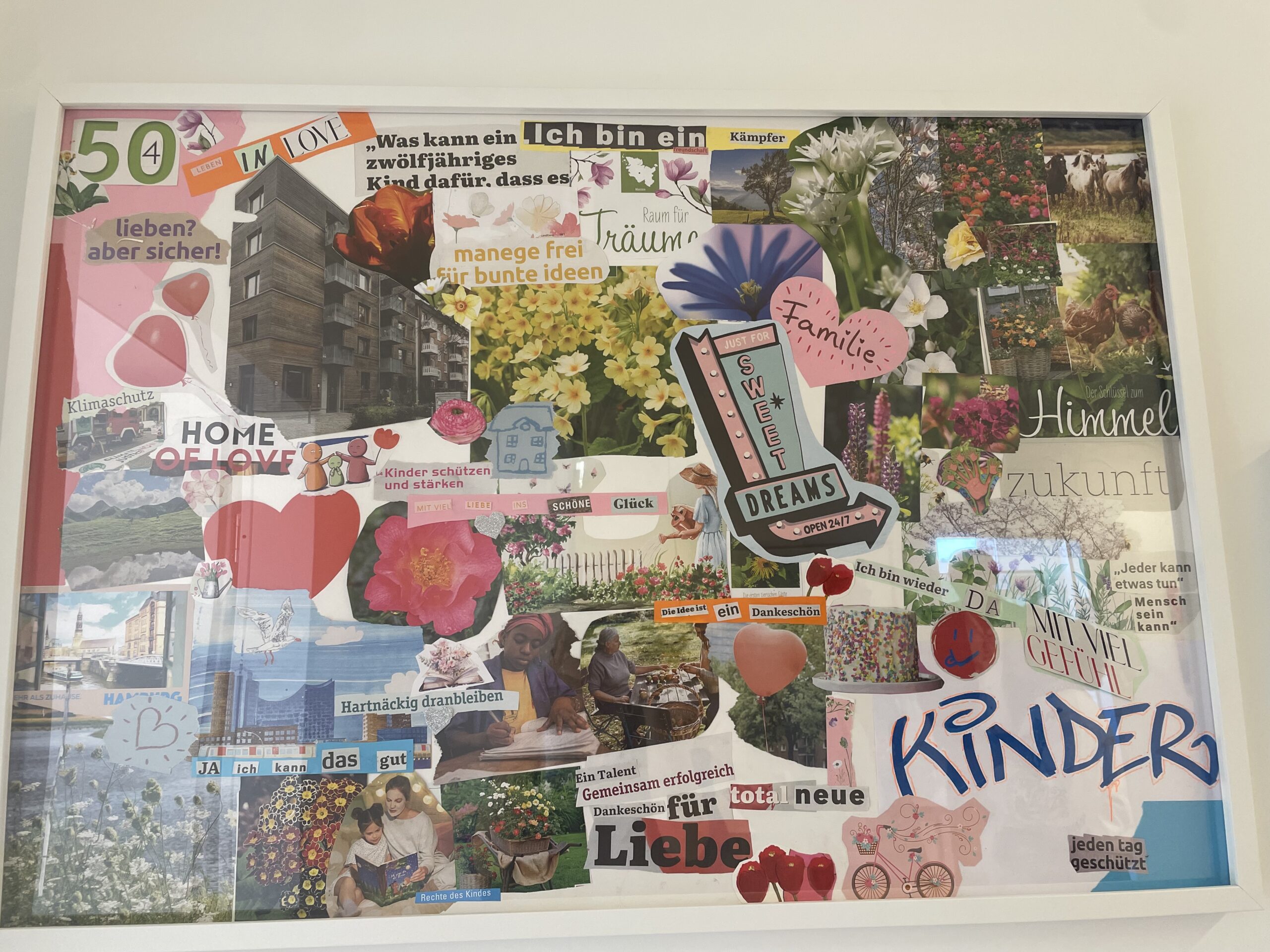 Anschließend wurden alle Elemente auf zwei großen Leinwänden zusammengebastelt und es entstanden zwei bunte Collagen.