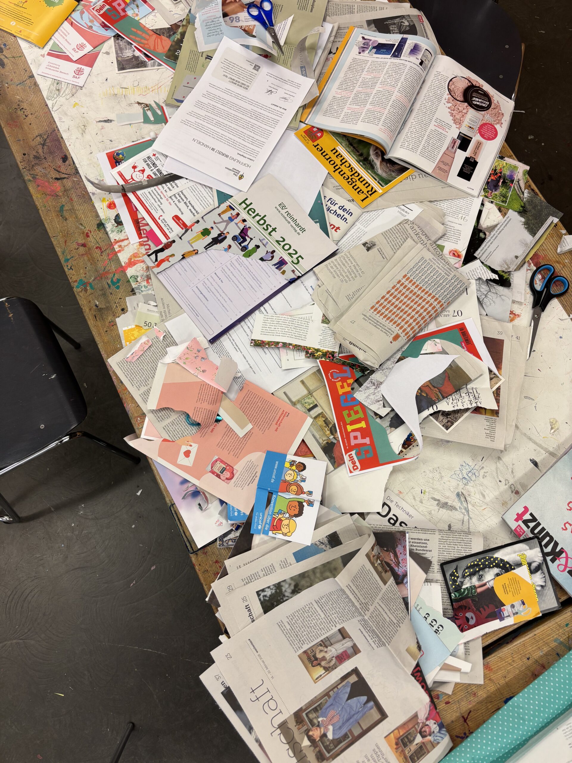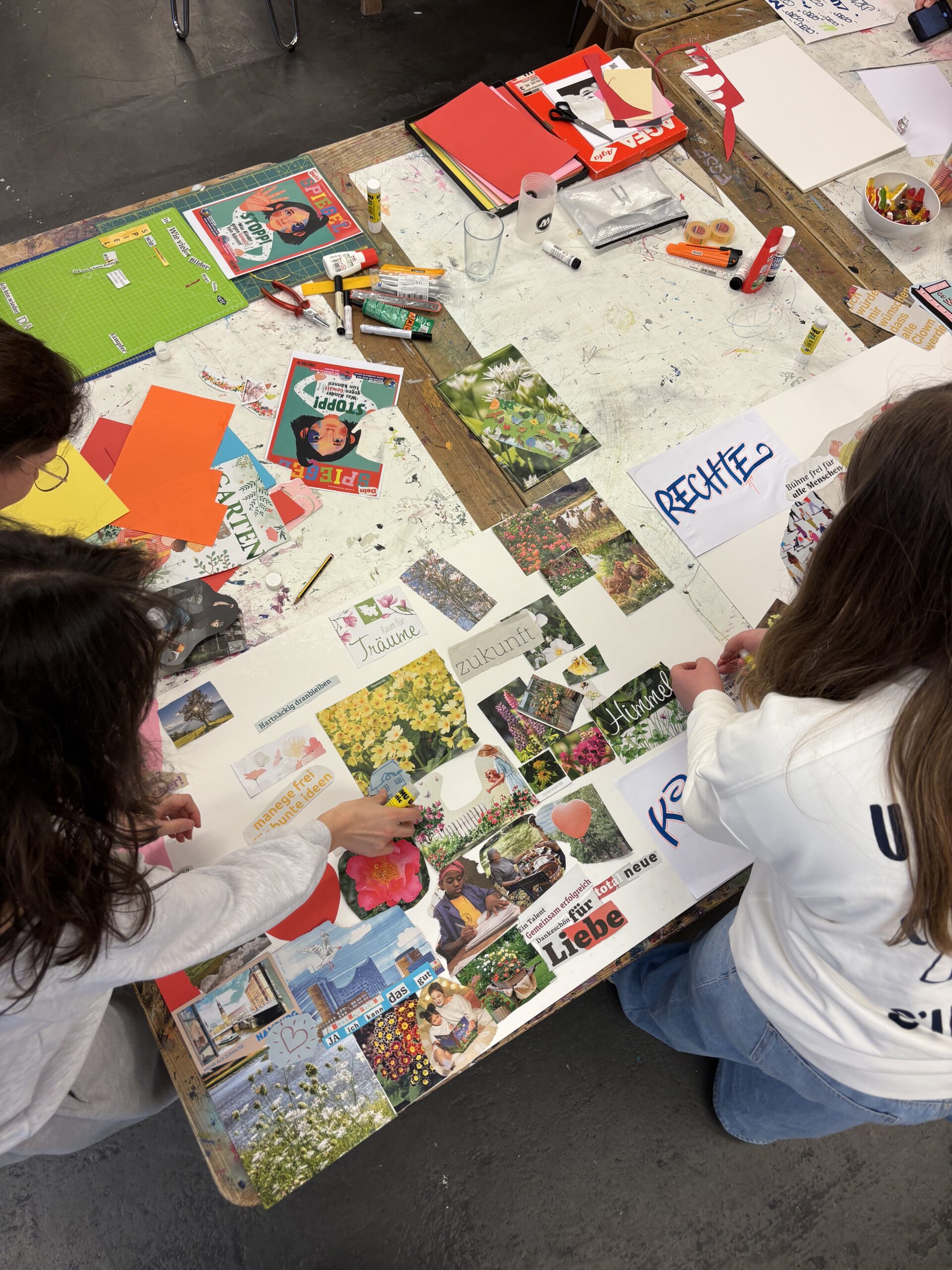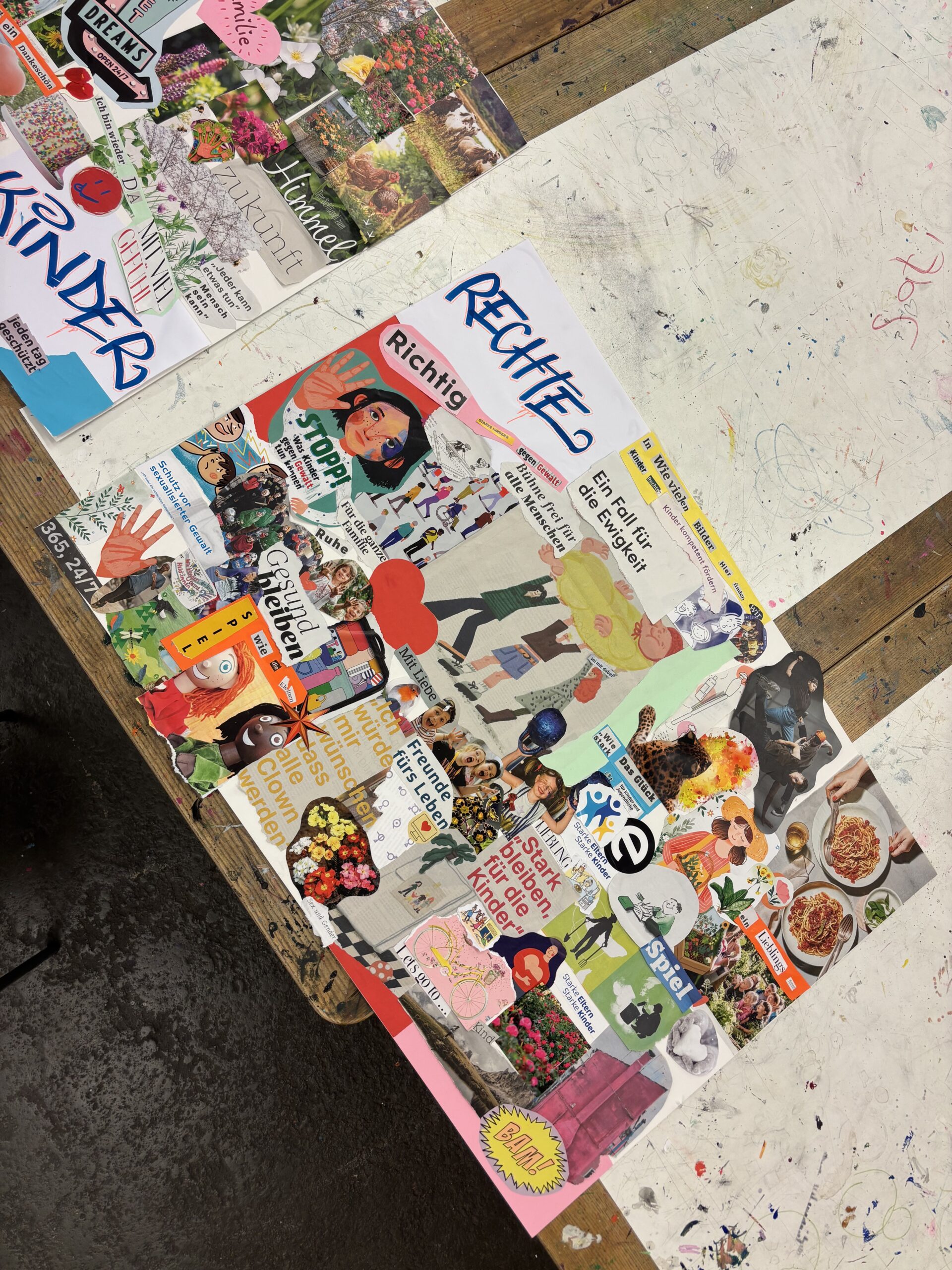 Nachmittags ging es weiter mit einem Collagen-Workshop für die älteren Kinder und Jugendlichen. Zuerst haben sie gelernt, was Collagen sind, wie sie Aussagen treffen können und wie man sie erstellt. Danach durften alle selbst loslegen: In Zeitungen, Magazinen und Flyern wurden Symbole, Bilder und Texte gesucht, die zu Kinderrechten passen.